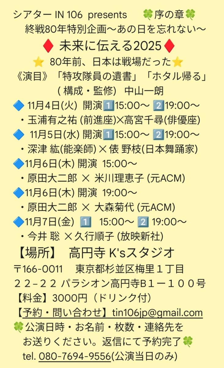 出演情報 中山一朗 2025/10/17 【構成・監修 中山一朗】 「シアター IN 106 presents 終戦80年特別企画~あの日を忘れない~ ♦未来に伝える2025♦ 80年前、日本は戦場だった」 11/4(火)~7(金)15:00~・19:00~開演 高円寺K'sスタジオにて